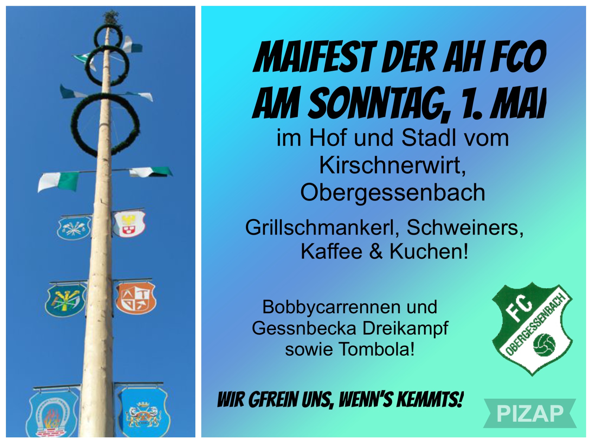 Die AH des FCO und der Vereinswirt, Hans Kirschner, laden ein zum traditionellen Maifest in Obergessenbach am Sonntag, 1. Mai 2022. Im Kirschnerhof ist angerichtet für Alt und Jung: es wird ein Bobbycarrennen stattfinden, der Gessnbecka Dreikampf sowie eine Tombola, bei der man als Hauptpreis den Maibaum gewinnen kann.