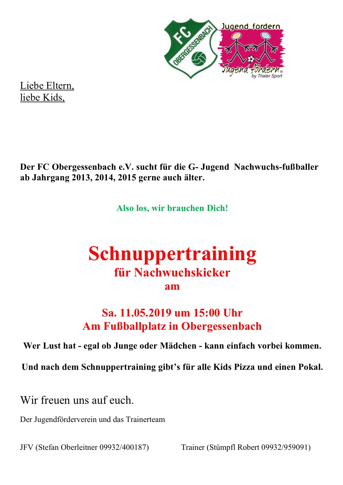 Bei Fragen wenden Sie sich bitte an Stefan Oberleitner vom JFV (Tel. 09932 / 400187) oder an Trainer Robert Stümpfl (09932 / 959091).